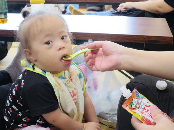 場所を変えて食事の時間。いつもの給食もおいしいけど、みんなで食べるお弁当も格別(#^.^#)