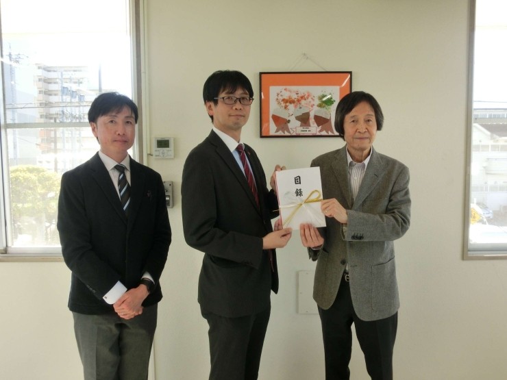義援金贈呈式です。中央執行委員長・松下裕紀様(中央)と書記長・加藤大輔様(左)、
