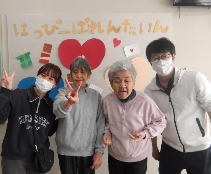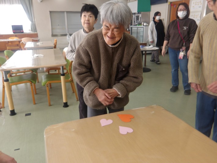 選んだハートを好きなところに貼ってみんなで協力して可愛く壁面を完成させました♪