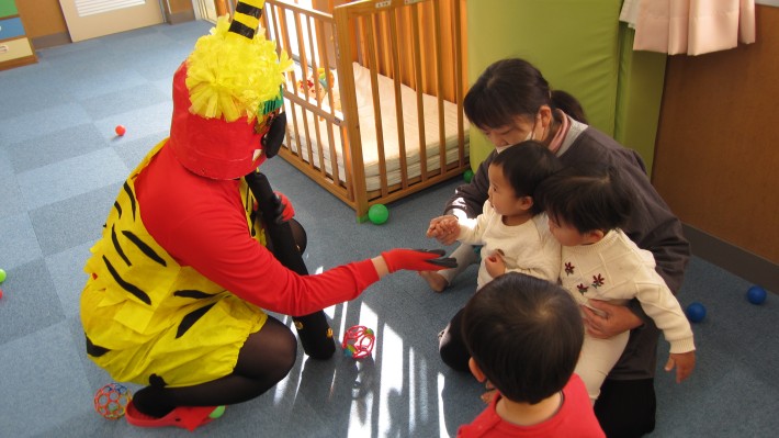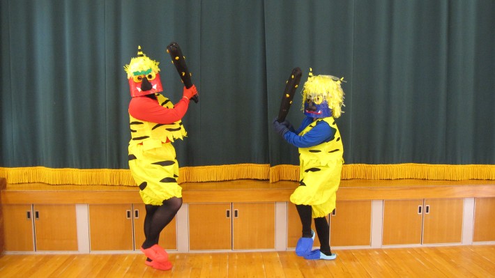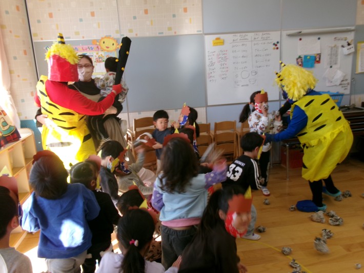 今日は節分行事が行われました。職員が扮した赤オニ、青オニが各部屋に行くとこども達は「豆」ならぬ新聞紙等で作った玉で応戦!!!園内に元気な「鬼は~そと! 福は~うち!!」の元気な声が響き渡り、厄払いとこども達皆の健康を祈願しました。