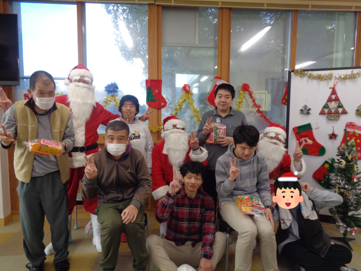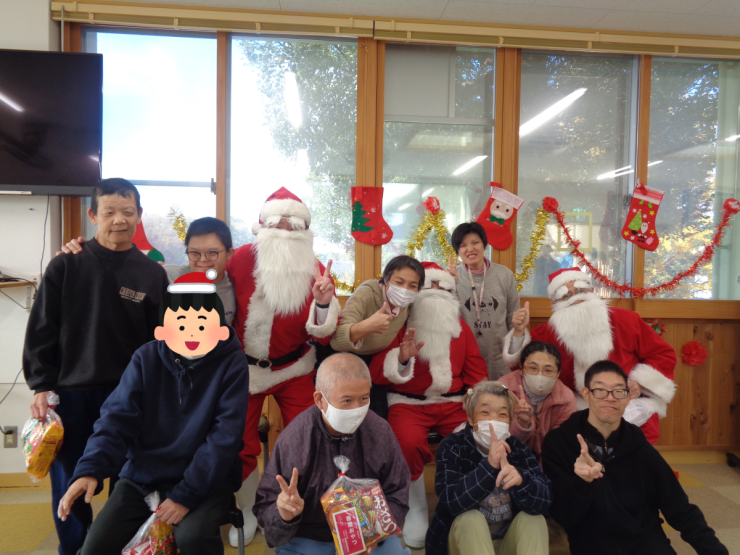 をお迎えし、利用者の皆さんに手渡しでお菓子のプレゼントをいただきました。皆さんお菓子をもらえて嬉しそうにしていました。お菓子を片手に一緒に写真を撮りました。