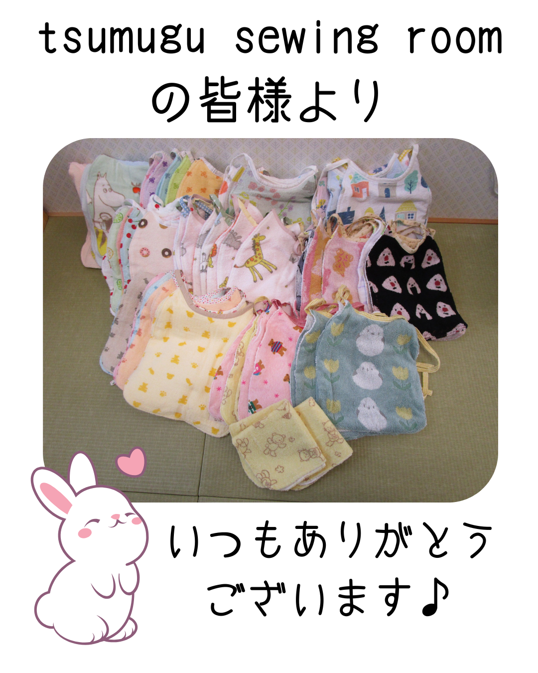 お知らせ 豊橋ひかり乳児院 2026.04.30 tsumugu sewing roomの皆様 ありがとうございます いつもこどもたちの食事用エプロンを手作りしていただいています。 8名の方よりかわいいエプロンが届きました。 「楽しい食事時間になるように」 「たくさん食べて大きくなってね」など心温まるお言葉も添えてくれていました。 お心遣いに感謝いたします。